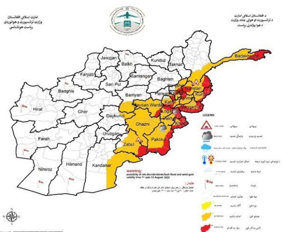 ریاست هواشناسی افغانستان از احتمال بارندهگی شدید همراه با رعدوبرق، سیلابهای آنی وبادهای شدید لحظهیی درولایتهای بدخشان، نورستان، کنر، لغمان، ننگرهار، پنجشیر، پروان، کاپیسا، کابل، میدان وردگ، لوگر، پکتیا، خوست ،پکتیکا، بامیان، دایکندی، غزنی، زابل و کندهار خبر داده است.