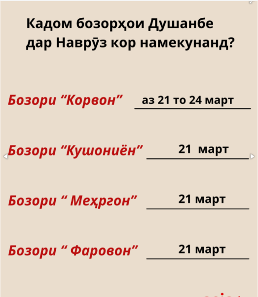 Аз ҷумла, бозори «Корвон»,"Корвон-плюс« ва „Корвон-ситӣ“ рӯзҳои 21, 22, 23 ва 24-уми март кор намекунанд. Ин бозорҳо шуруъ аз 25-уми март ба кор оғоз мекунанд.