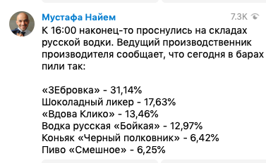 Найемнинг ихтиёрига бешта сўровнома натижалари келиб тушган. Қонунчиликка кўра, овоз бериш якунларига қадар экзитполни эълон қилиш тақиқланади, муаллифлар буни «украинлар қайси алкоголни афзал кўришлари бўйича маркетинг тадқиқоти» номи остида тарқатишади. Президентликка номзодлар алкогол ичимликлар маркалари номлари билан шифрланади.